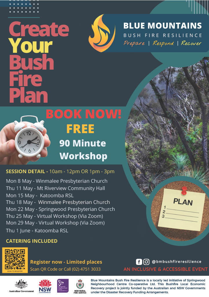 Now, they are partnering with the Rural Fire Service to deliver 90-minute, hands-on workshops to assist participants develop a household bush fire survival plan. RFS volunteers can answer questions and provide advice specific to individual and household circumstances. The outcome is that everyone will come away from the workshops with a draft bush fire plan. The workshops are catered, and specific dietary requirements can be indicated when you register. To register, call (02) 4751 3033 or click here. Sessions are running in different Mountains locations from 8th May to 1st June.
