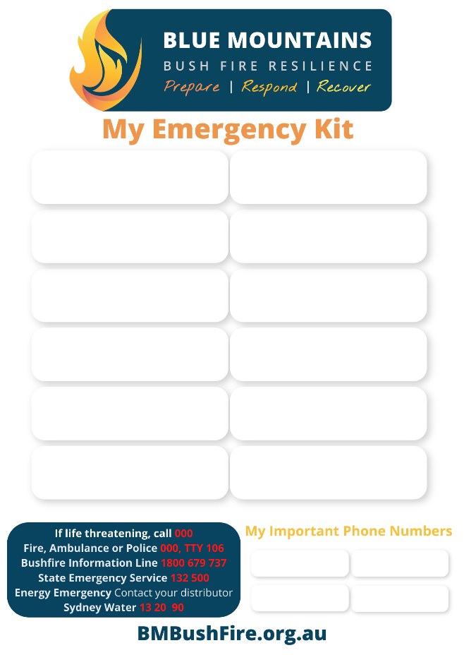 Blue Mountains Bush Fire Resilience Emergency Kit Checklist (front and back)