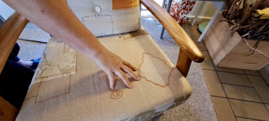 After noticing a stubborn tea stain on Manda’s mum’s favourite chair, rather than re-upholster it Julie chose to stitch around the stain. By doing this simple act of repair she was both honouring the history of the chair and the life of Margaret her mother-in-law: the person who loved to sit and drink her tea on that chair for many years.