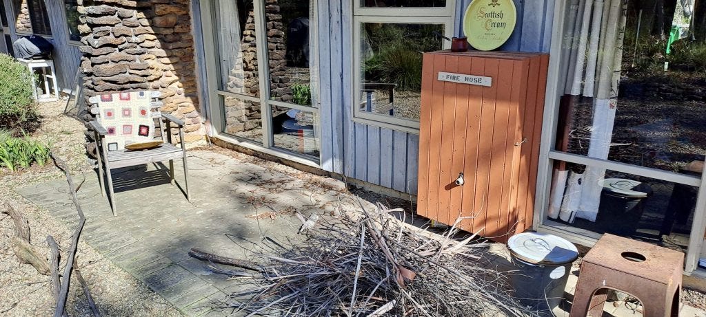 Sticks gathered ready for removal to reduce the fuel load near the house. Fire hose fed from the dam.