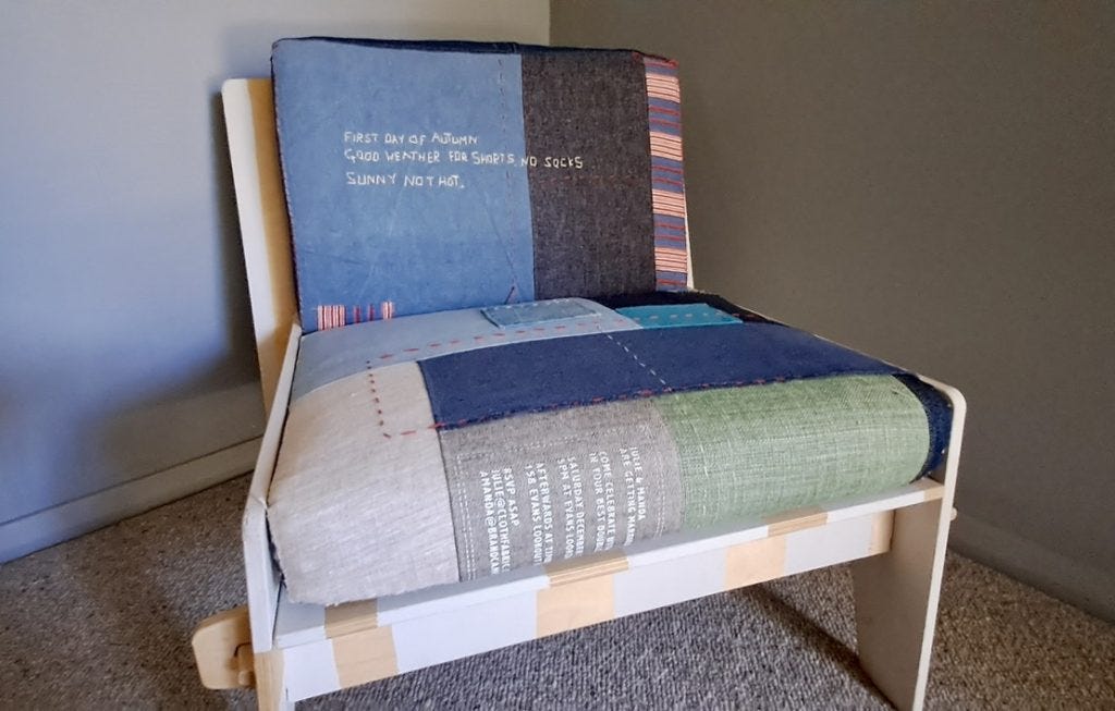 An old Ikea chair that was in the exhibition in Shoalhaven. Re-upholstered with recycled foam, fabric and stitched into life.