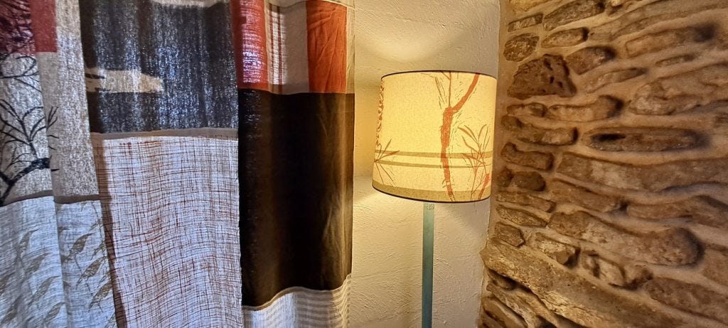 Inside the cabins there are patchwork curtains made from old sample books and vintage blankets and tiles she made and locally fired. Objects such as lampshades reveal the hands of the maker and the history of their materials. The fabrics are often drawn together with embroidery. Sometimes this looks like landscape features from above, or geometries that complement the printed organic forms. Words are also stitched in places. They speak whimsically of how humans and materials express each other and are poignant signposts to a way of being that’s in harmony with the world.
