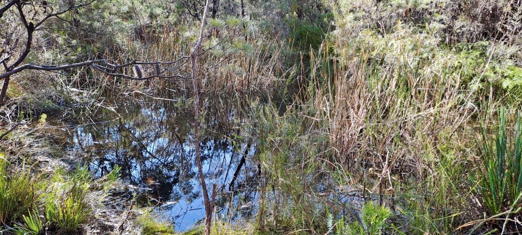 We head outside so Julie can show me the fire preparations she and Manda are making. Julie points to a bundle of sticks as we exit the house. “We’re gathering sticks and leaves and moving them away from the buildings.” There’s a box on the wall labelled ‘FIRE HOSE’. It’s a system the architect devised. He built a dam above the house that feeds the hoses using a petrol generator. The dam is edged with reeds and sedges and there is a cacophony of frogs. It’s a water resource for fire mitigation and a habitat for indigenous species.