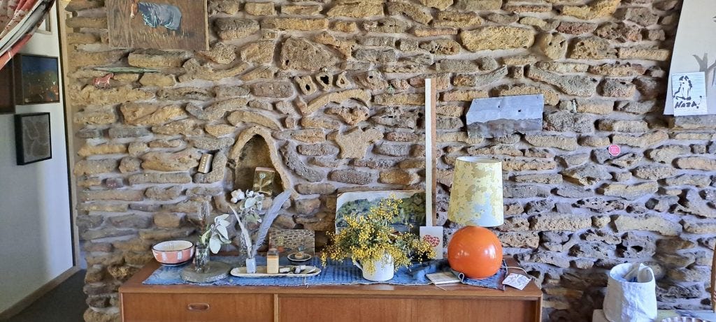 Inside the house it’s delightfully cool. Julie tells me that the house was built by conservationists and landscape architects Ian and Sue Olson in the 1970s. The couple lived in a caravan during the build. There was no power on the site, so everything was hand cut which makes for soft geometries. All the internal walls are made of iron stone sourced from the property. I comment on the temperature and Julie says it’s primarily because of the stone’s ability to absorb, store and release heat.