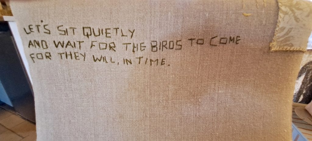 To do this Julie provides sewing kits in the cabins. The idea is that people can repair what they bring when they come to stay. The cabins are inspiration for this process. Julie says she also wants people to leave their own meditation on repair by embroidering a section of curtain. In this way, the cabins become a collaborative exhibition that grows and transforms over time.