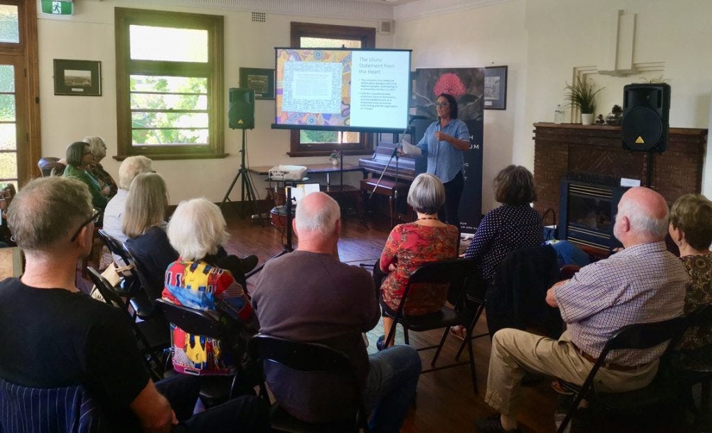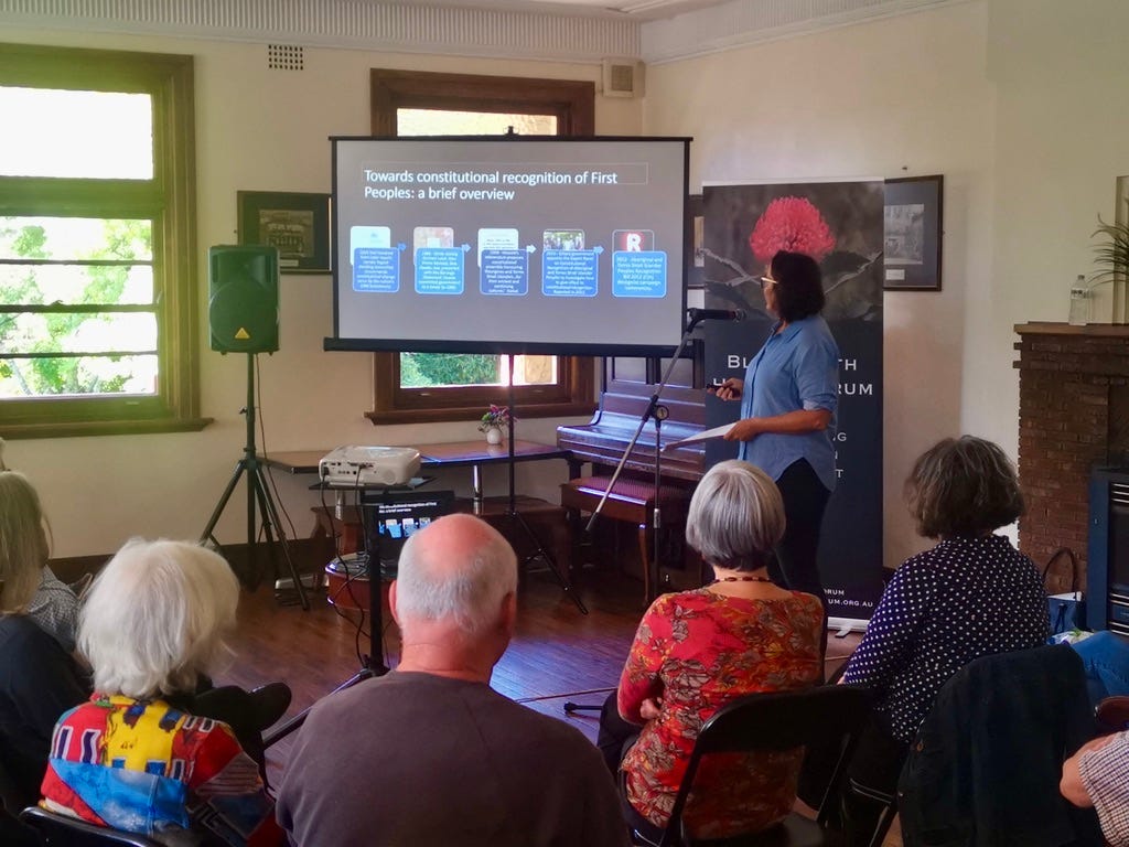The event I’ve been at in Blackheath was held at the Gardeners Inn. It was the first meeting of the Blackheath History Forum in 2023 and Professor Heidi Norman was invited to speak about the Voice to Parliament. She is a Gomeroi woman from northwestern New South Wales. She starts her talk by paying her respects to the traditional owners of this land, the Dharug and Gandangara peoples. Her gaze turns to the railway line you can see looking out the pub windows. She talks about how her Aboriginal family worked in the Pilliga Forest where Cyprus Pine was harvested for railway sleepers. They contributed one way or the other to radical changes in the forest.