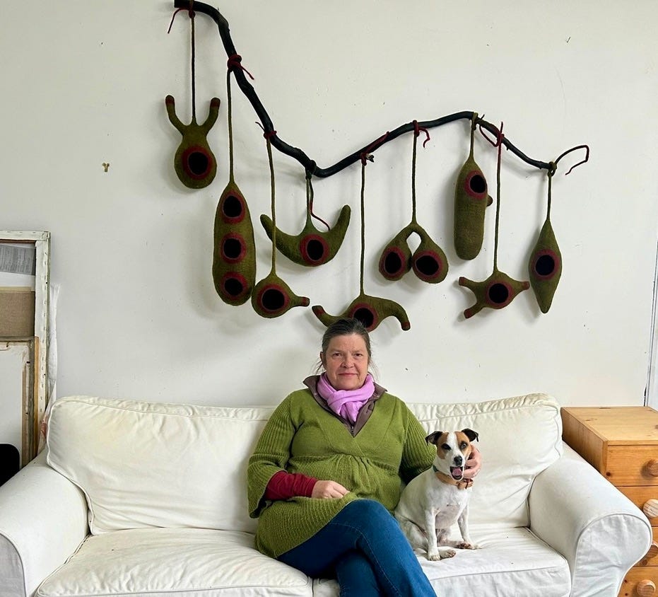 Saskia and her dog Tucker with artwork Refuge in her studio (Liz Durnan)