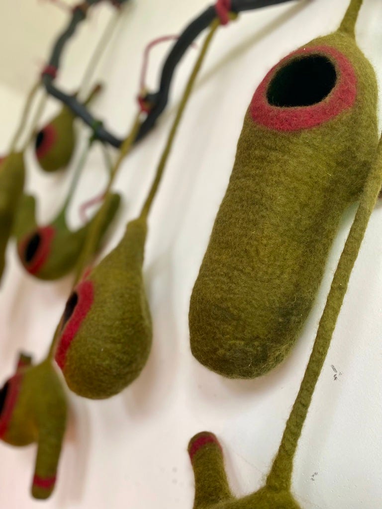 As with Refuge, Honey Homes is about loss of habitat. “It’s about making a symbolic home for them because each pouch is like a little habitat.”