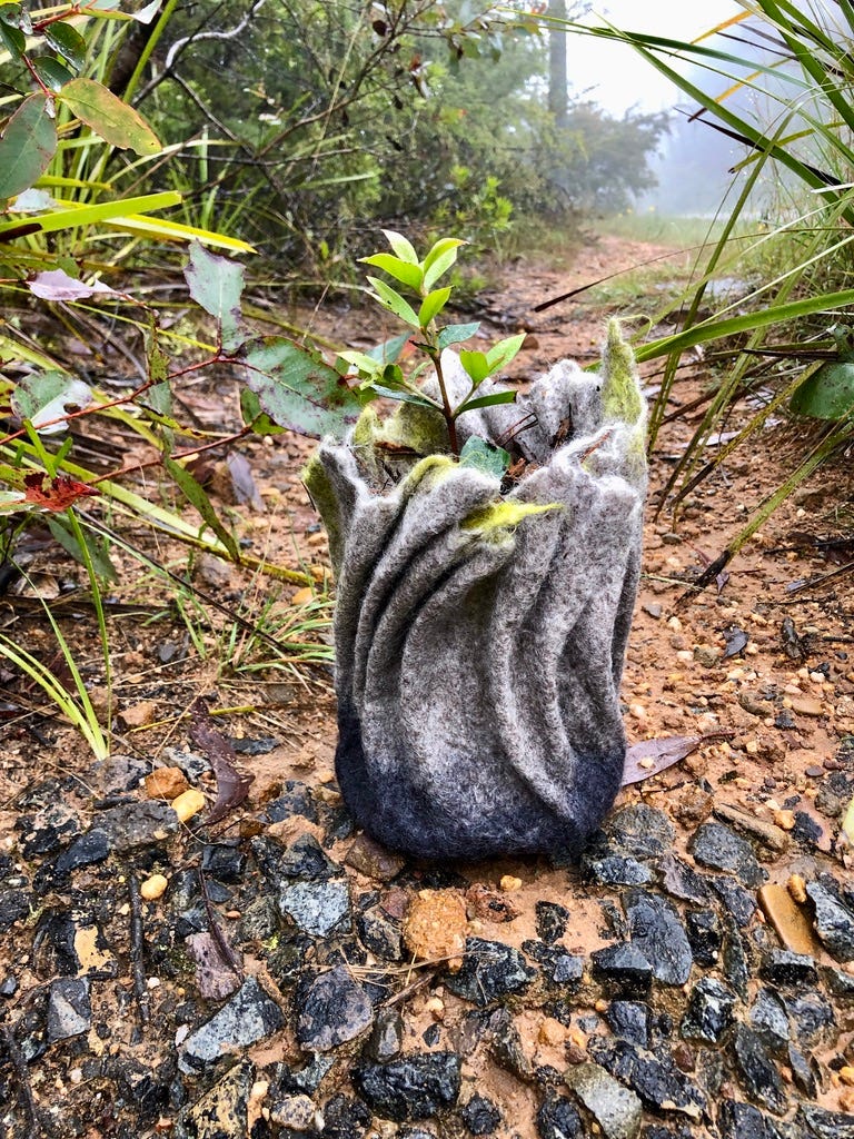 With Saskia’s home in Katoomba, right next door to the Blue Mountains Wild Plant Rescue nursery, she acquired all 59 native trees there and created the pots herself with felt made in regional NSW. The felt is biodegradable so after the exhibition, the potted plants could be planted straight into the ground, the felt even helping to hold moisture.