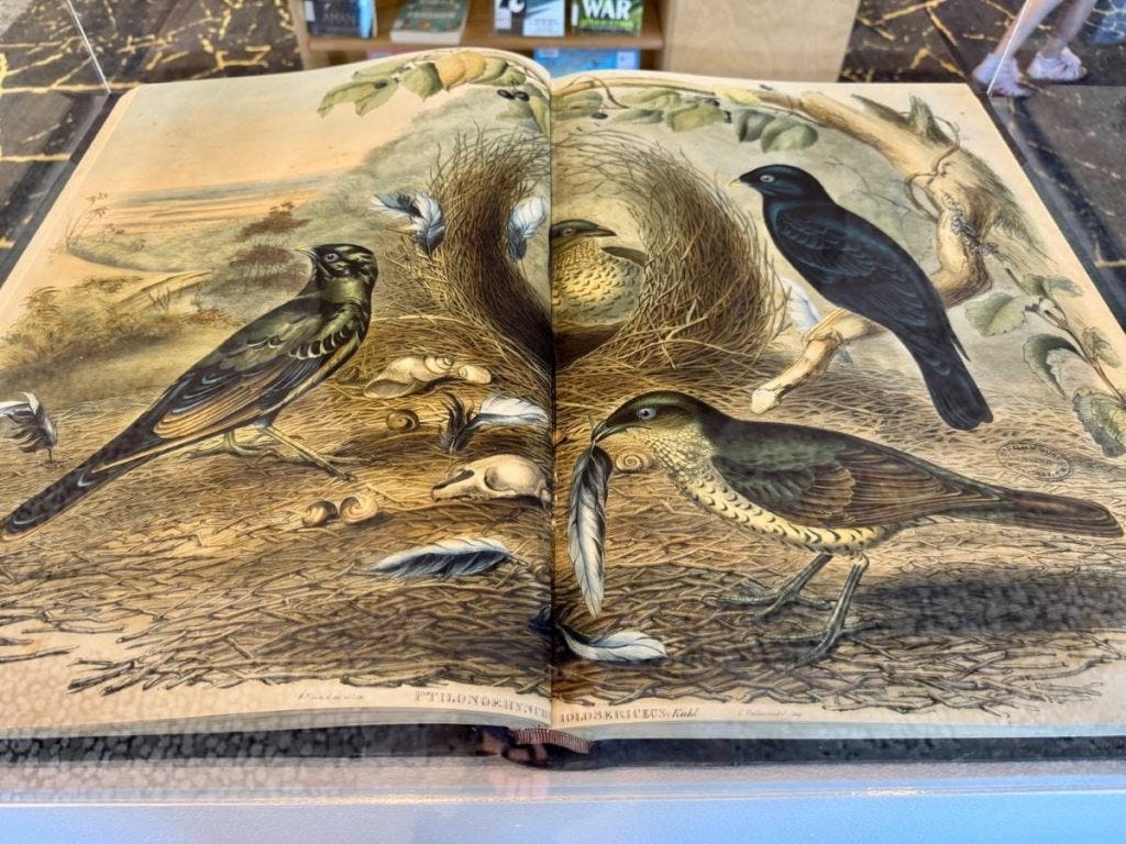The book contains 680 exquisite lithographs and the page depicting Bowerbirds was on display on February 15.