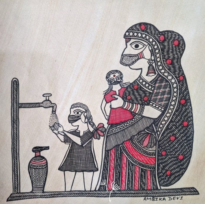 And then, of course, there’s the cultural issue of wearing masks. Until recently the idea of wearing a mask was alien to us in Australia – except this last summer when we began to contemplate mask-wearing to cope with the dreadful air quality produced by the bushfires. In East Asia, however, it’s been cultural to wear masks for quite some time. It’s a sign of respect for others and a way to demonstrate our collective responsibility to reduce disease transmission. In India folk artists are now producing artworks of gods and ordinary people of all ages wearing masks.