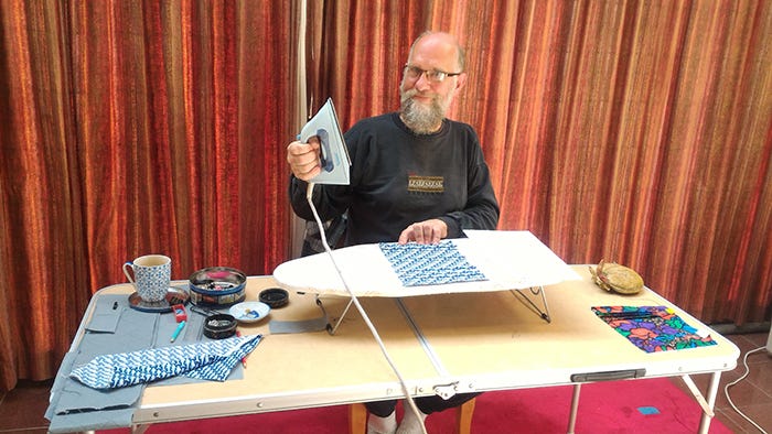 Bob Rollins ironing fabric for mask making
