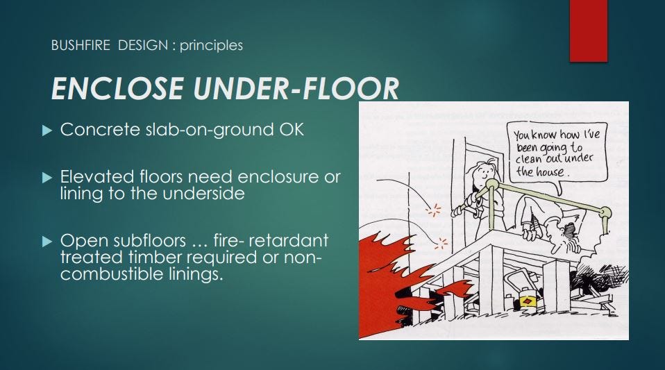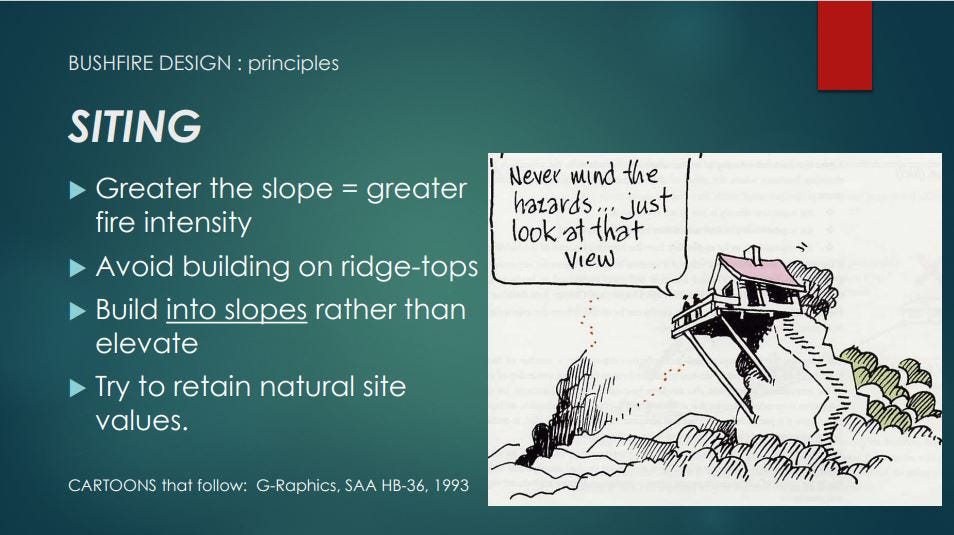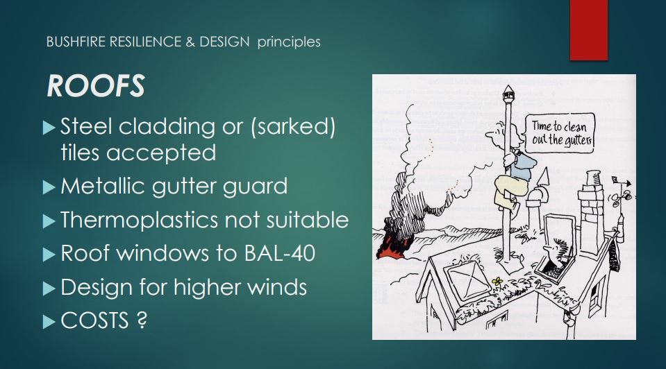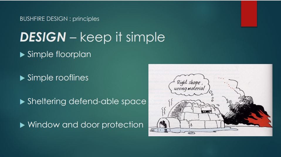 Nigel outlined the design fundamentals for anyone wanting to build or retrofit a home in bushfire-prone areas, which is almost all of us who live here in the Blue Mountains.