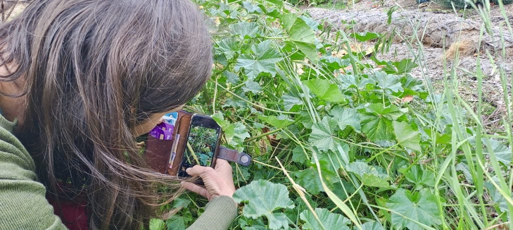 Alice Blackwood leans in to photograph an insect in the Permaculture Hub ready to upload to iNaturalist. (Tracie McMahon)