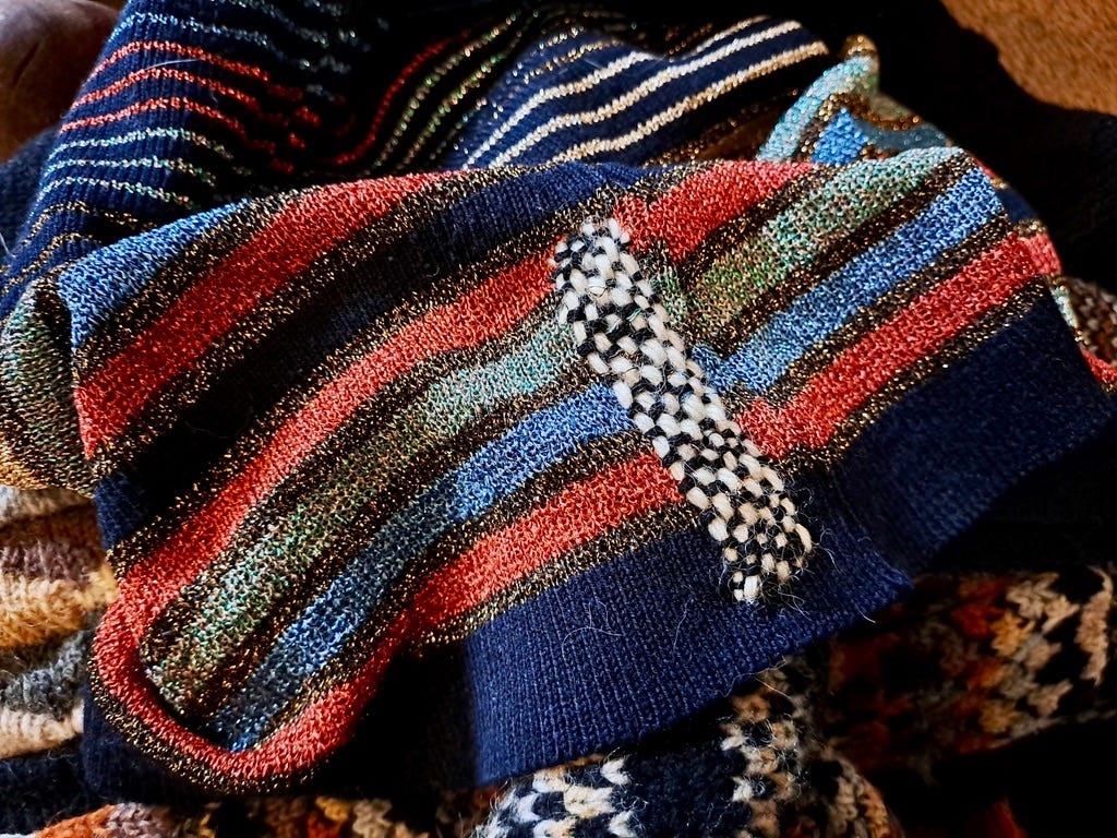 There’s visible darning and invisible darning,” Robyn told me. “ I think the visible darning adds to it and gives it character.” She smiled as she held up clothes in which a hole had been turned into a funky patch or eye-catching pattern. One of them, a child’s vest, she gave away to a new grandmother at the event.