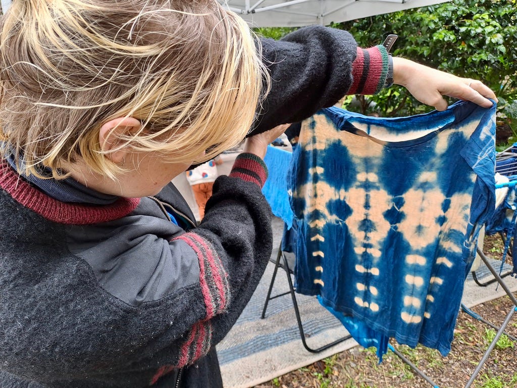At the dyeing station, where artist Pip Bishop shared her knowledge on indigo dyeing, I witnessed a similar thing. A group of people gathered, some dipping their old pillowcases or t-shirts into a steaming vat of indigo. Others stood by chatting, occasionally stopping their conversation to admire the revealing of a freshly dyed item. Here too there was obvious great value on offer – the transforming of old items into something fresh, as well as the incidental act of connecting with others.
