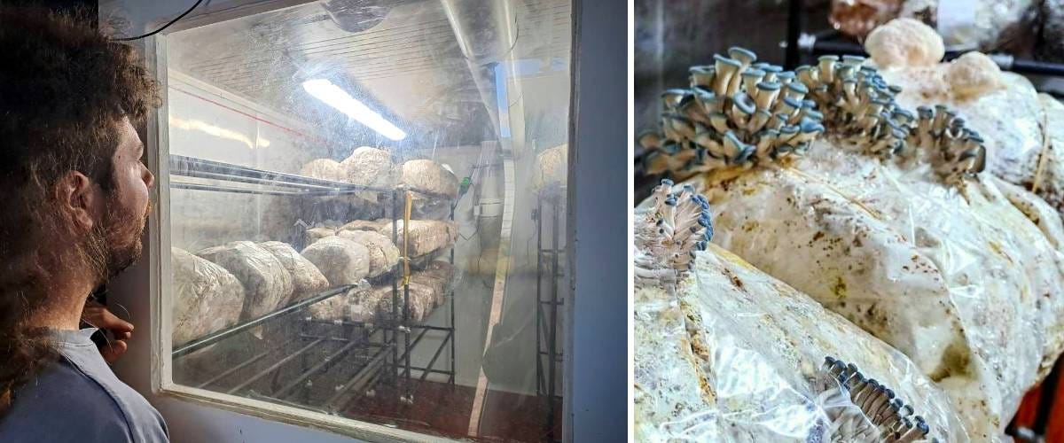 Left: Alex created a viewing door for visitors to observe the growing process without contaminating the space or breathing in spores. Right: Young Blue Oyster mushrooms on the rise with Lion’s Mane in the background.