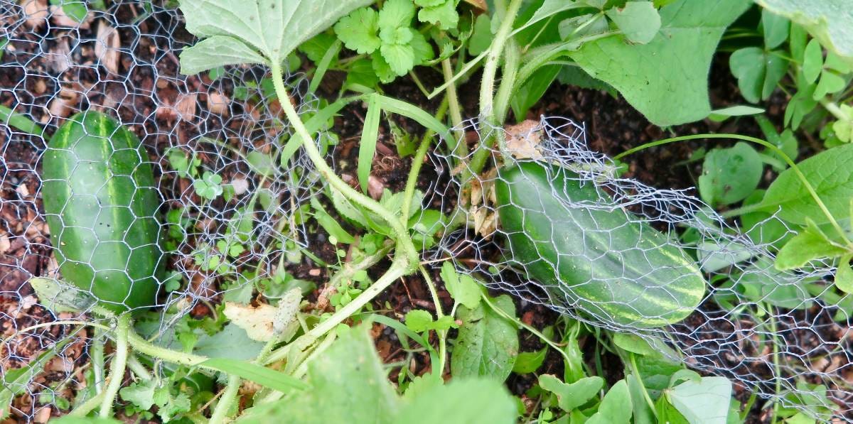 Nifty idea. Wire cages protecting the cucumbers against hungry wildlife like mice and possums – are highly effective, Chris says.