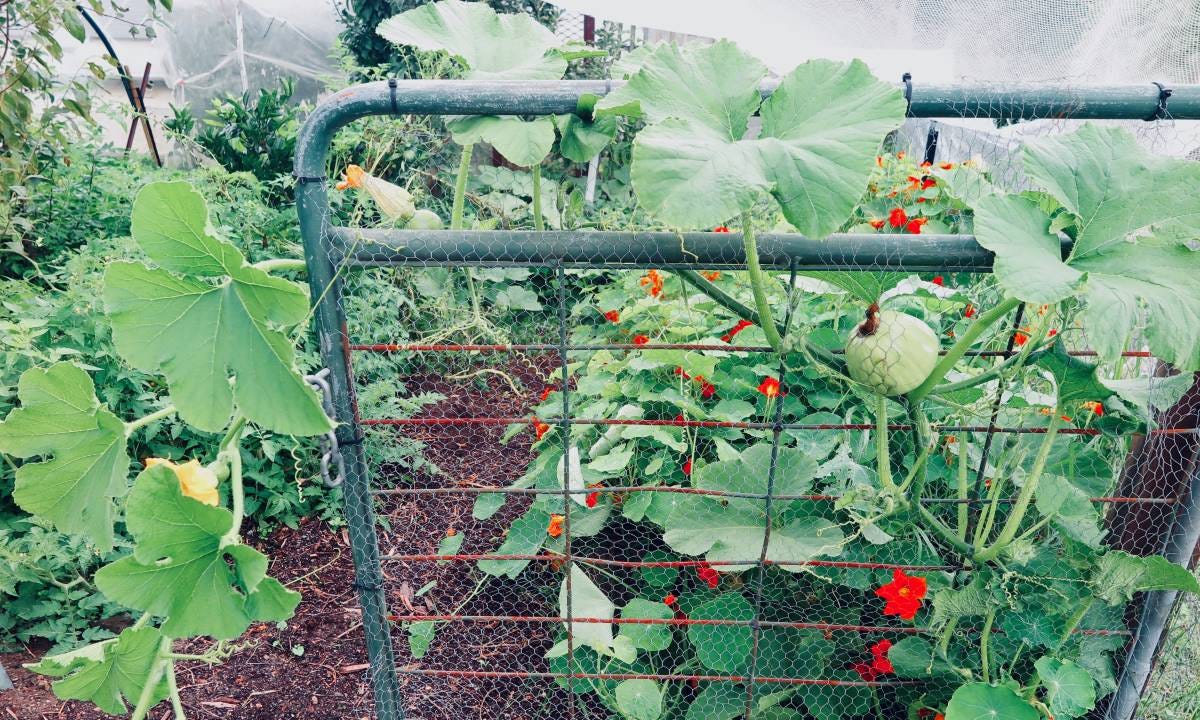 Gaps in the enclosure allow bees in (to fertilise this pumpkin) plus other creatures beneficial to the garden.