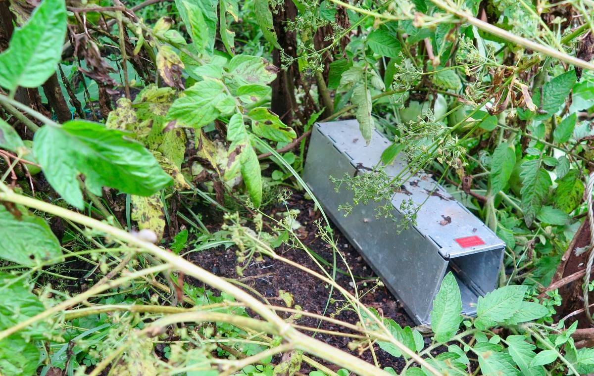 To combat mice and rats, Chris has an Elliot Trap in the garden. An inexpensive and humane option for rodent issues, it’s a small, metal box with a spring-operated door and weight sensitive base. When triggered by something entering the box, the door closes.