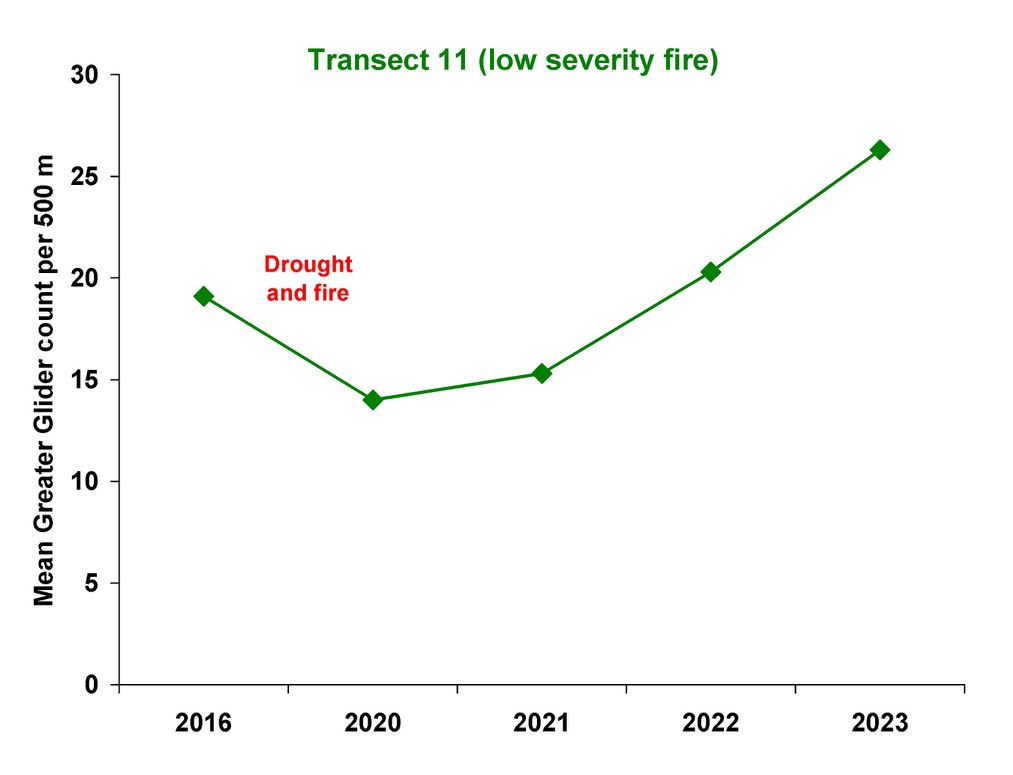 A graph showing an example of the recovery of Greater Glider numbers at one of Judy and Peter’s study sites at the southern end of Blue Mountains National Park. This site was burnt only at low severity. The first post-fire survey revealed there had been a distinct reduction in Greater Glider numbers compared with 2016, due to extreme drought, heatwaves and fire.