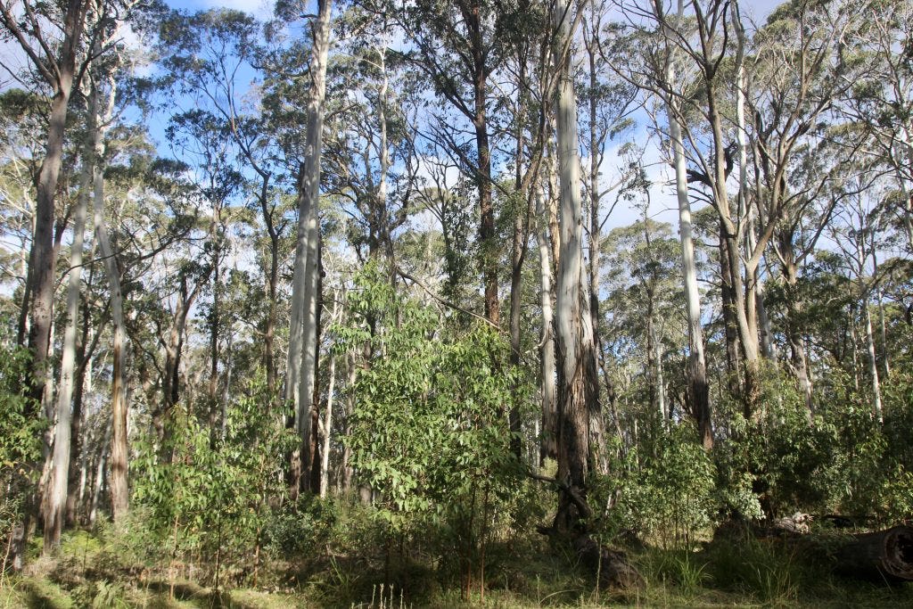 Vegetation in the study site highlighted in the graph (southern end of Blue Mountains National Park) in May 2023. It’s a favourable habitat for Greater Gliders which has always supported good numbers. It now supports “exceptionally good numbers“. (Peter Smith).