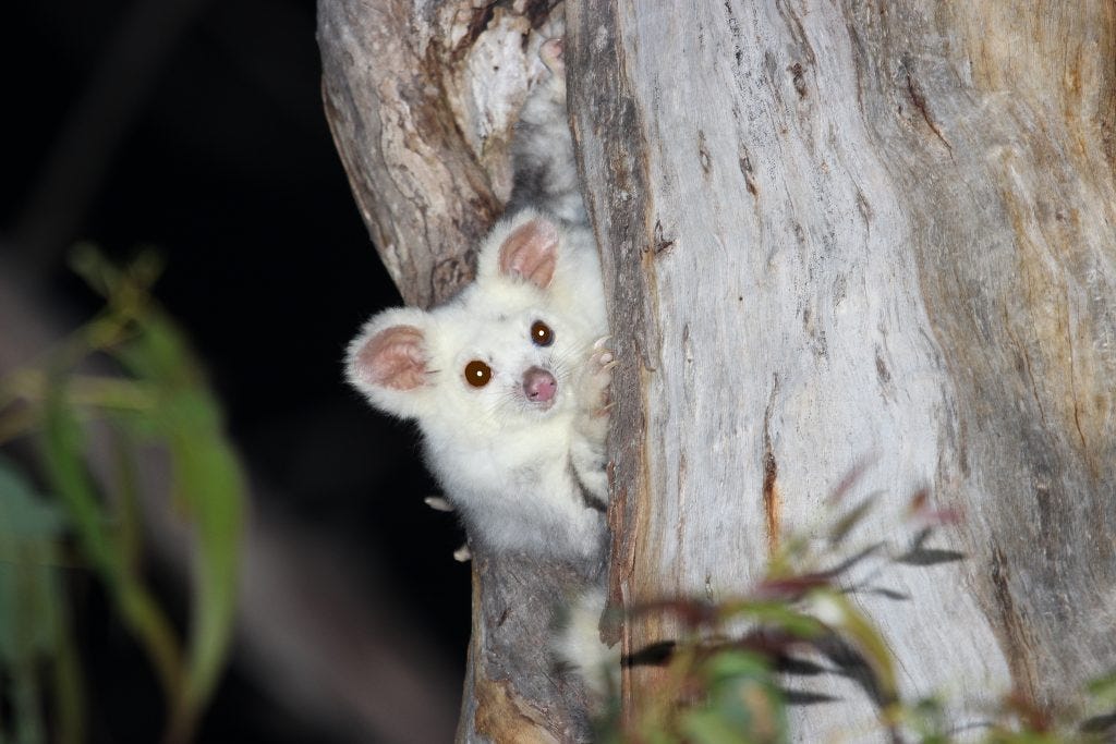 Peter and Judy nicknamed this pale phase Greater Glider ‘Snowy’ at Blue Gum Swamp Creek in February 2021 (Peter Smith).