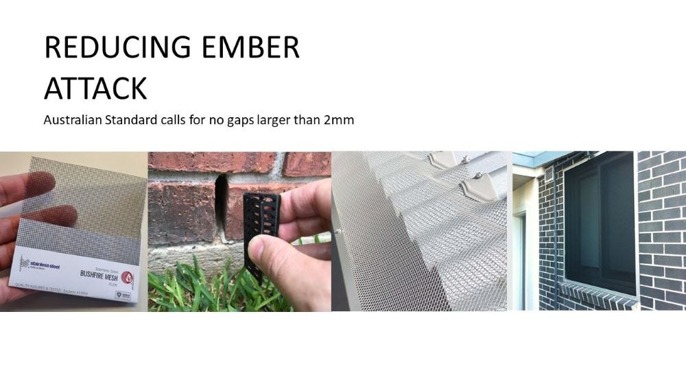 In the image above there are numerous fire vulnerabilities. These include plants being too close to the building; an open porch where embers can get underneath; and no protection over the guttering and under the eaves. “There are products to assist with making your home more fire resistant,” Simon says. These include mesh products and heat-resistant gap fillers. Stopping ember getting into or under buildings is critical. It’s worth remembering that 80% of houses burn from the inside because of ember incursion.”