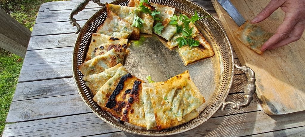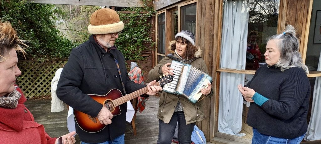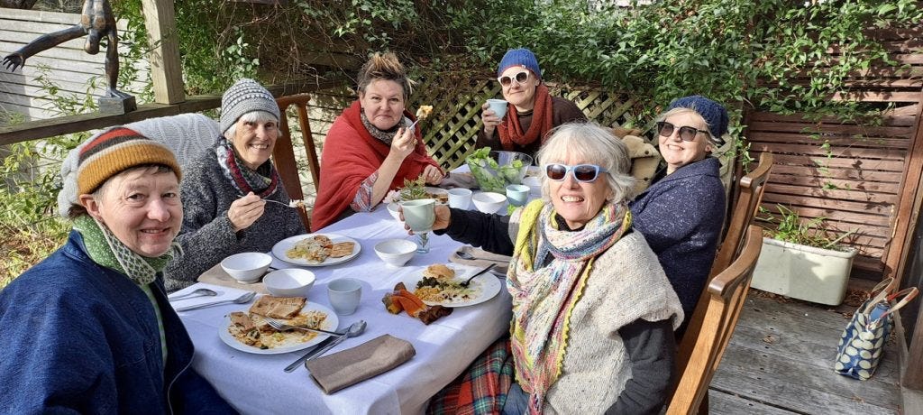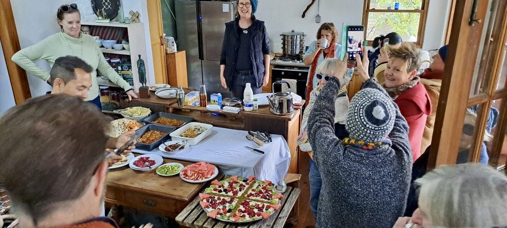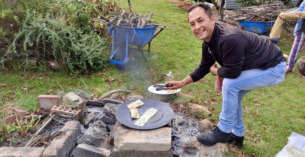 By 1pm the trickle of people arriving at Bower Cottage has turned into a stream. Everyone is layered up because most of the lunch tables are on the deck. A musical duo from Wollongong play rousing European folk songs. People join the singing and two people play spoons to liven up the beat. Laughter is in the air and good will fashions all the spaces in the house. There are spirited conversations and quieter moments, where words are woven around the scent of Afghan cuisine about to be served.