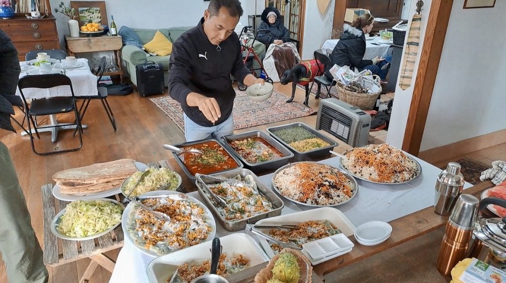 I am warmly greeted by host Anna Ingham. She and Esmat came up with the idea of the fundraising lunches. The money goes to support a group of Afghan women studying to be nurses in Kabul. Following the Taliban takeover in 2021, nursing became the only vocation women could pursue. Still, the ban on women traveling without a familial male meant it was difficult for the women to get to class. The money from these lunches pays for a minibus to ferry them between home and university.