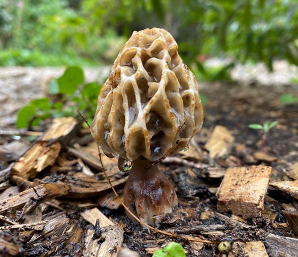 Last Sunday, however, we were blown away because it looks as though we might actually have the highly sought after edible Morel mushrooms at the Farm! They’re usually found in Spring not Autumn, and there ARE Morel imposters, but this looks very much like the mushroom prized by French cooks and described as American truffles in the U.S. Tomorrow we’ll cut it open and see if it’s hollow inside to confirm that it is, in fact, a Morel. Whether it is, or isn’t, it’s still as beautiful and sculptural as the others we’ve been finding this year.