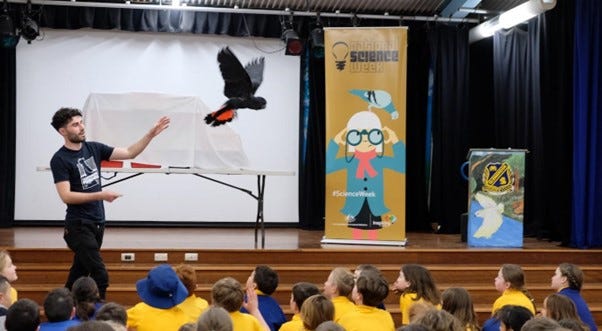 “It’s all about changing attitudes about science,” Samantha says as she and four National Science Week Volunteers, Dr Anika Mostaert, Dr Caragh Threlfall, Adrian Faull and Zorana McDavitt planned the event, which included an in-school visit from Feathered Friends Bird Sanctuary as well as tree planting, microscope observations, and assorted informational elements.