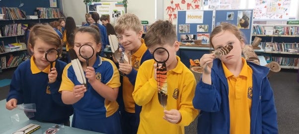 Following up on the free-flight bird experience, the children were treated to their library being transformed into an information hub all about the Glossy Black Cockatoo, with tables hosting different activities and information.