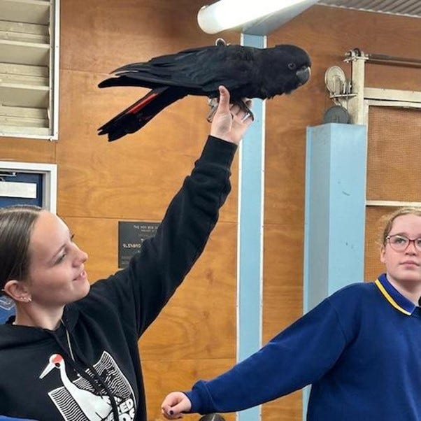 The Glossy Black Cockatoo visited the Glenbrook Public School as part of a demonstration hosted by local wildlife bird Sanctuary Feathered Friends. (Photo: courtesy Glenbrook Public School/A. Mostaert)
