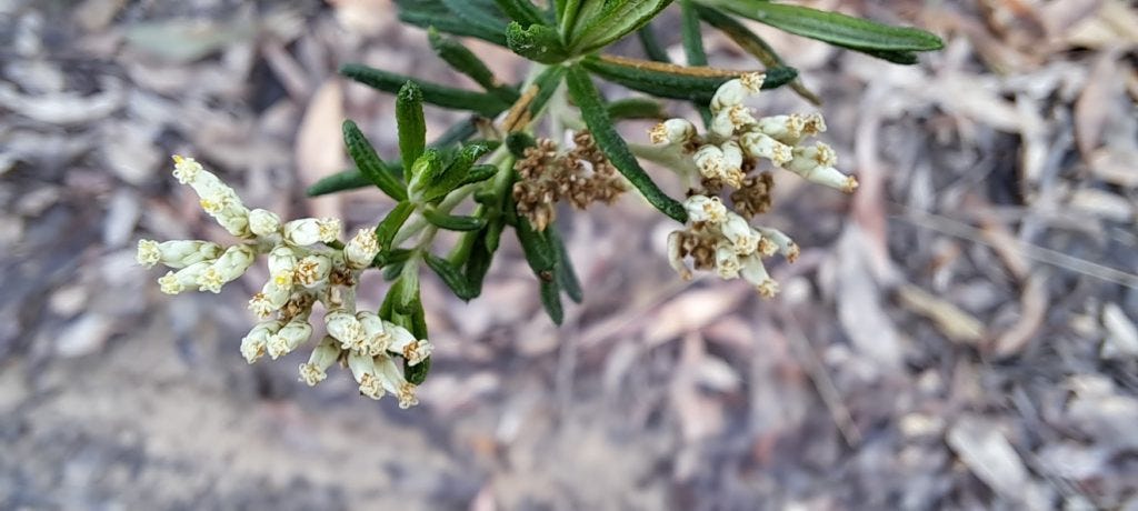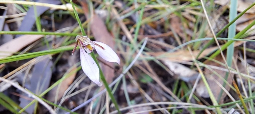We continue towards the water tank, and Helen and Suzanne point out places where orchids have been found in the past. There are tiny green stems in the leaf litter, which are the orchids’ pre-flower. Then we spot a bunny orchid in flower (also known as Leafless Parson’s Bands, Eriochilus cucullatus).