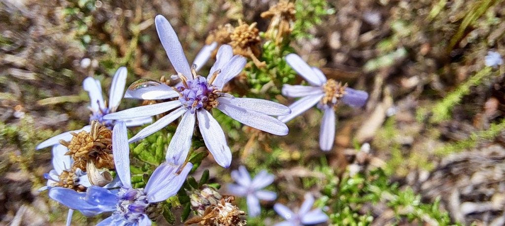 In a short distance, we pass a variety of plant communities. To the north an open forest woodland features towering trees. To the west in a sheltered gully, an understorey of wattle, daisy and tea-tree merges with ferns and grasses. This small section of landscape is dissected by sealed and unsealed roads, tracks and a transmission tower. Helen and Suzanne tell me about a mass orchid bloom behind the security fencing around the water tank. It seemed incredible to me that such an array of plants could survive on an urban fringe.