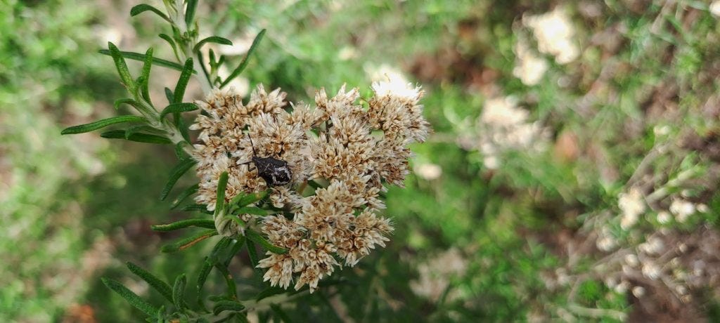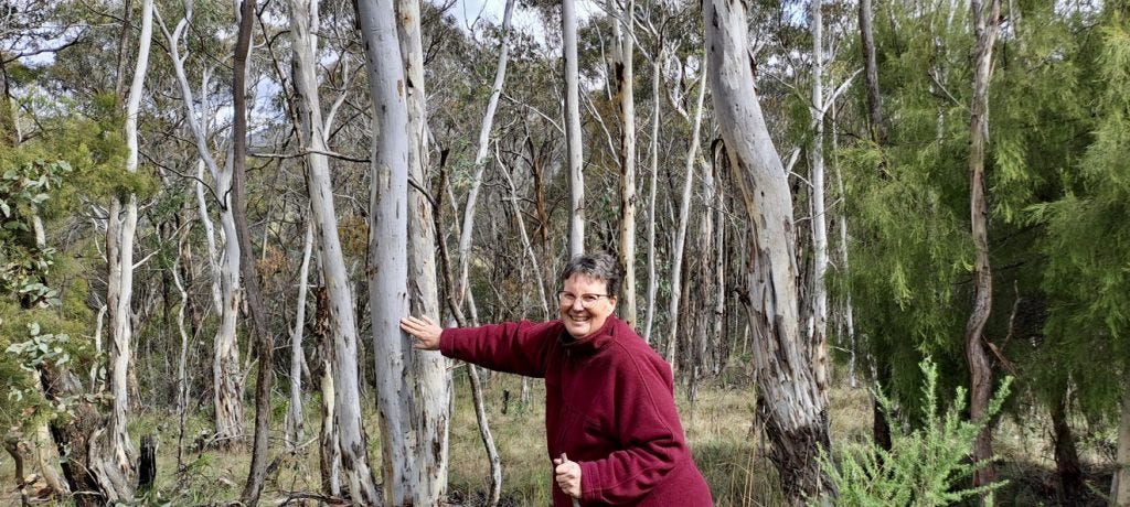 The weather clears and we head off on our bushwalk. While the sun squints from behind grey clouds, Suzanne stops to identify eucalypts. She rubs her hands over the bark of Eucalyptus mannifera and shows us the powdery sheen on her fingers: the tell-tale sign for this species.