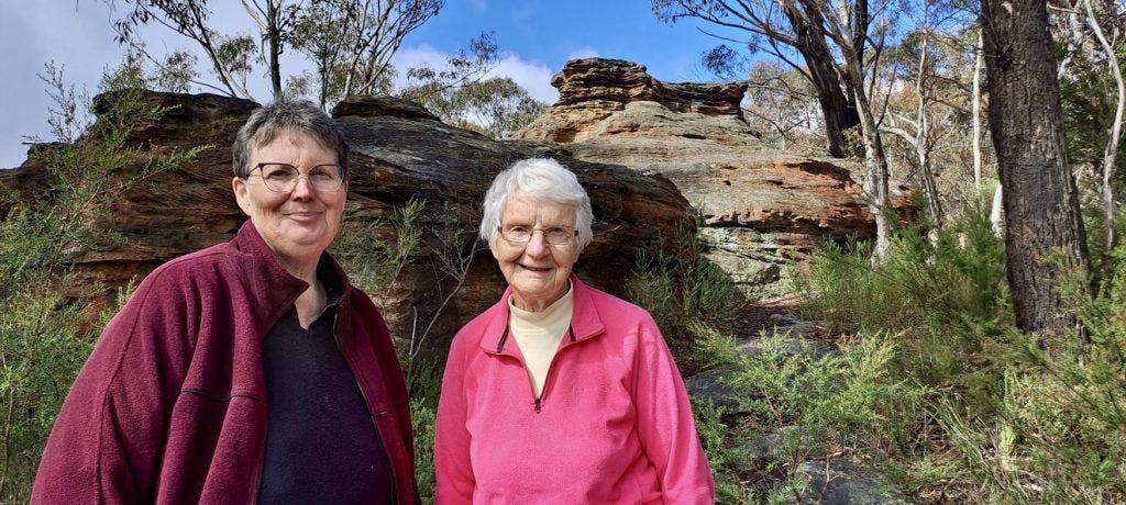 Suzanne Lollback (L) and Helen Drewe in front of a pagoda rock formation at Bracey Lookout.