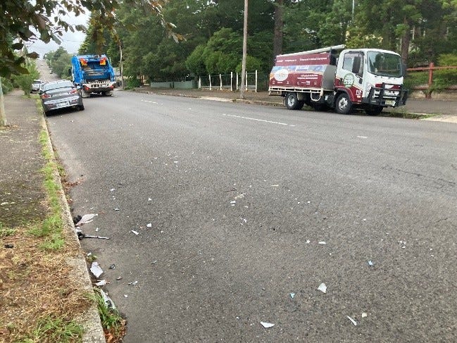 Vehicle crash debris on Katoomba Street, headed for our waterways