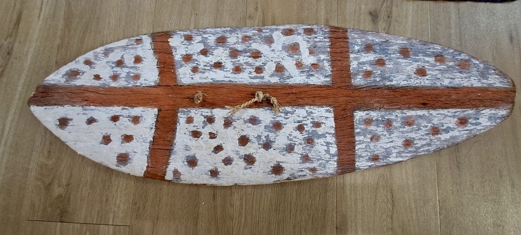 A shield carved out of stringy bark.