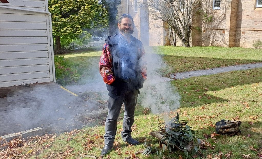 When I arrive at 125 Wentworth Street in Blackheath, there is a fire in a wooden coolamon, sitting on the grass. On top of glowing embers, is a clutch of green eucalyptus leaves. Smoke is streaming out and drifting across the path where people are entering the hall.