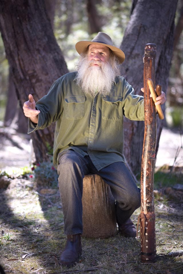 Lester developed a profound respect for Aboriginal culture early on, linked to his time living in the bush: “To have lived there, as the Aboriginal people have for thousands and thousands of years, knowing where and when to obtain food, being able to drink from the streams without worrying about them being polluted; more connected to country than what our civilisation is today … Aboriginal people have taken me out bush and I’ve learnt Aboriginal law. Stories are told that teach. We learn to listen, to gain knowledge, to respect, to be humble, not to show off or to put others down. In the modern world, those that have the most material wealth are praised. In Aboriginal culture, those who share are thought of more highly.” As well as these cultural insights, Lester is a phenomenal didgeridoo player. “I like the didge,” he says, “a natural instrument that’s connected to this country – a log eaten out by termites.”
