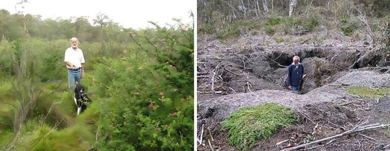 Left: The pristine Farmer’s Creek swamp Right: Chris Jonkers in the East Wolgan Swamp, damaged by mining operations draining the swamp (Photos: LEG)