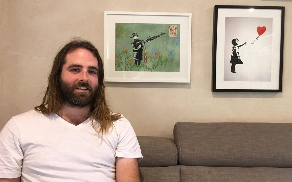 I am sitting on a couch, in a simple but beautifully-crafted strawbale home, set on 45 acres in the Kanimbla Valley. It’s not quite finished. I’m listening to Matt Anslow. Behind him on the wall are a set of framed works by Banksy – the notorious, but anonymous, British street artist, whose satirical and darkly humorous stencils are copied by graffiti artists around the world. In his stencils, a little girl is letting go of a heart-shaped balloon, while a little boys stands in a field of roughly sketched flowers and fires a machine gun.