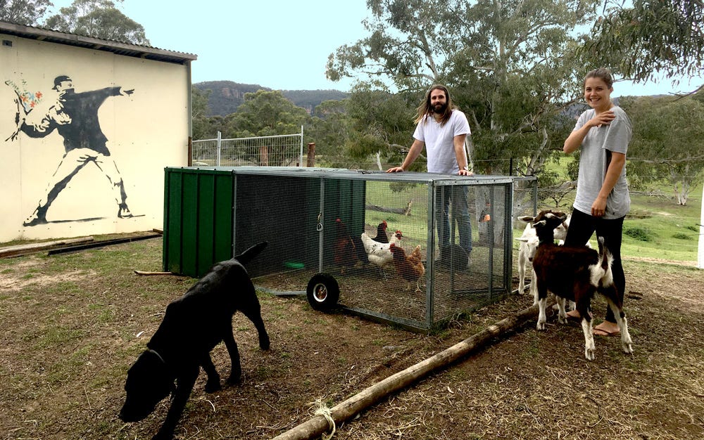 We go for a walk around Matt and Ashlee’s farm and talk permaculture. When they lived 8 storeys up in a unit in Sydney they even grew greens and cherry tomatoes and raised chooks on their balcony. Here they have a proper chook run, goats, a dog and a large Banksy stencilled onto the side of the shed. It’s a masked protester, but he’s throwing a bunch of flowers instead of a bomb.