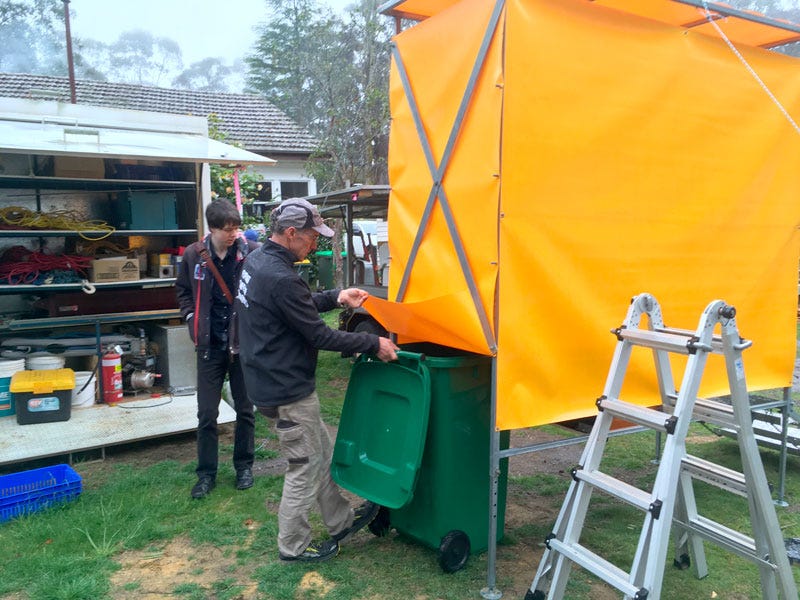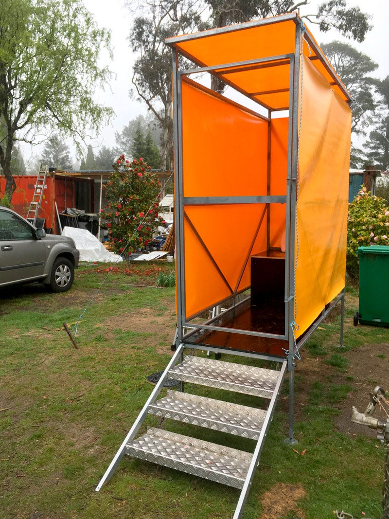 Now, Trihey is working on his own design for a composting toilet, inspired by the permaculture organisation Milkwood and in collaboration with Ascent Consulting Engineers in Blackheath. During my interview I was able to see the recently completed prototype of the new design, with metal fabrication by Peter Hodgkinson, assembled in Trihey’s own backyard. The design is relatively simple, using a frame of galvanised steel, vinyl siding and a plywood seat and floor making it light, strong and able to be flat packed for easy transportation.