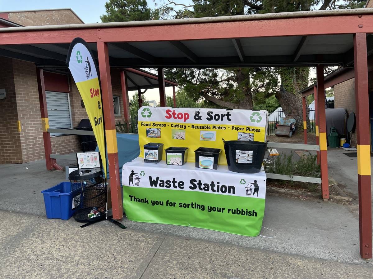 With the support of Lawson Public School, Magpie Markets was selected to trial a new system, with Cheryl and Erin running new Recycling Hubs and Nicole funding them from market profits. “We have reduced the waste going into landfill from 8-10 big bags to 2-3 smaller bags. We are introducing reusable plates to food vendors and washing them in the school dishwasher. Paper plates are sorted and the least spoiled ones are put in our new large recycling dumpster. We collect hundreds of coffee cups which we divert through our Simply Cups program (returned to Seven-11). Return And Earn containers are collected and the money raised is used to help pay young people to assist on market days.”