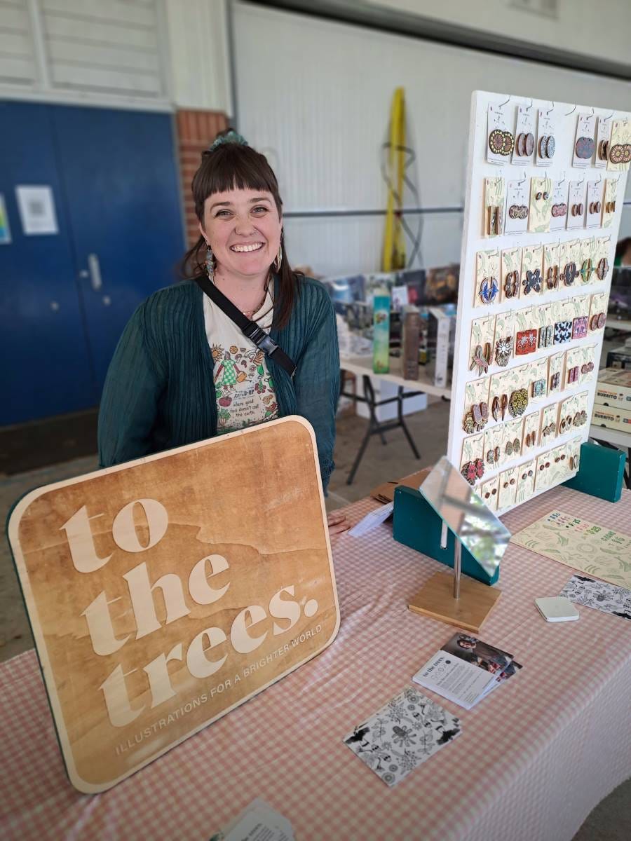Lauren Gero is a freelance illustrator selling wooden jewellery and greeting cards at the markets. The name of her business came from an early illustration that depicted a person walking away from a city with polluted waterways and towards the trees. The symbolism is apt for Lauren’s products, which depict animals and nature. She hopes her work will “encourage connecting with the earth, which builds love and then leads to the protection of the earth.”