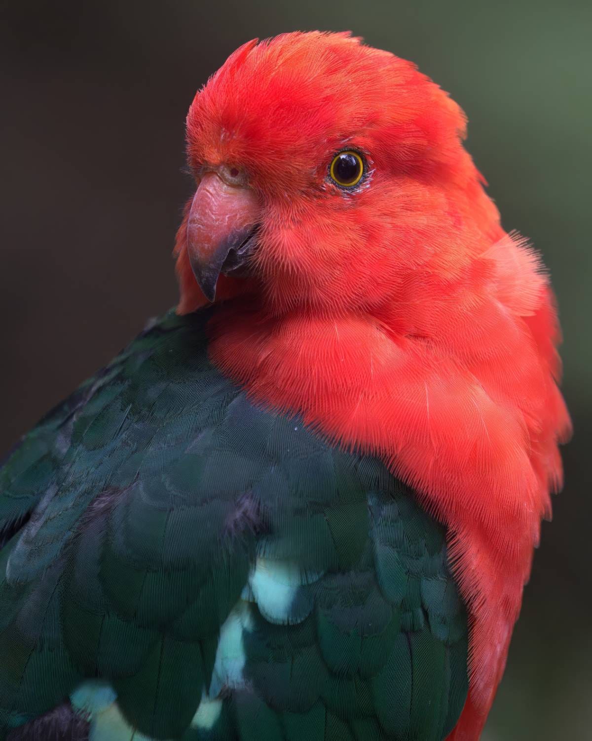 King Parrots are not only beautiful to look at, they are also very special to interact with. I was visiting a friend when this male flew into her yard. As he flew down from a tree to a hose cart, I felt the wind from his wings, he was so close. There was no food offered but he really seemed to look at me and listen as I talked to him. One thing I love about this photo is the connection; he was looking right at me.