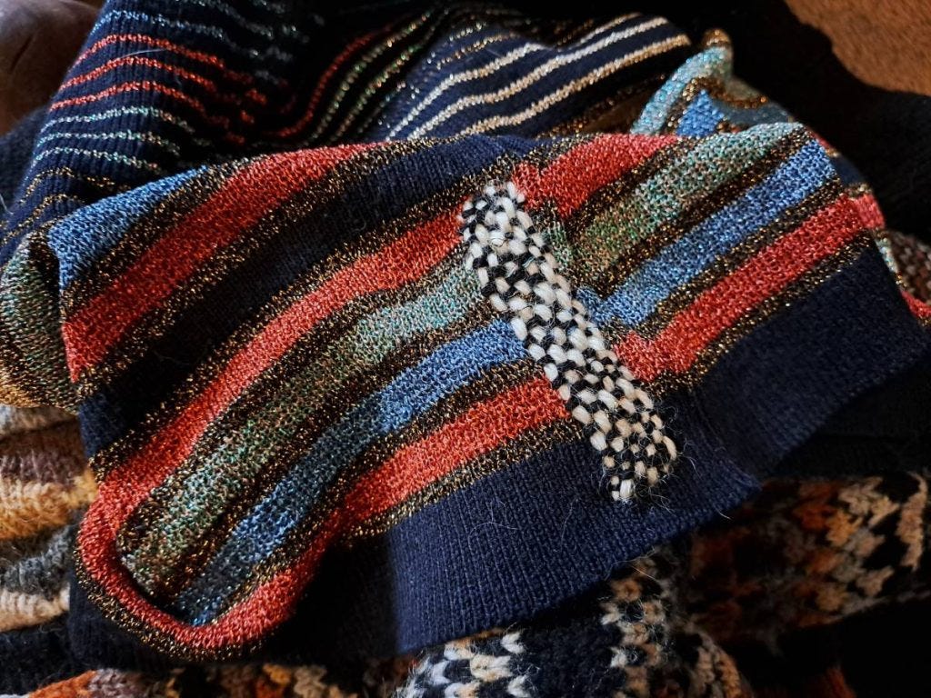 Not quite kintsugi, but philosophically aligned, this visibly mended garment by Mid Mountains’ Robyn Maloney embraces the ‘imperfection’ and extends its life.